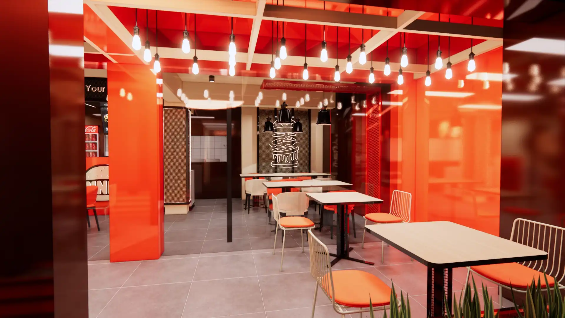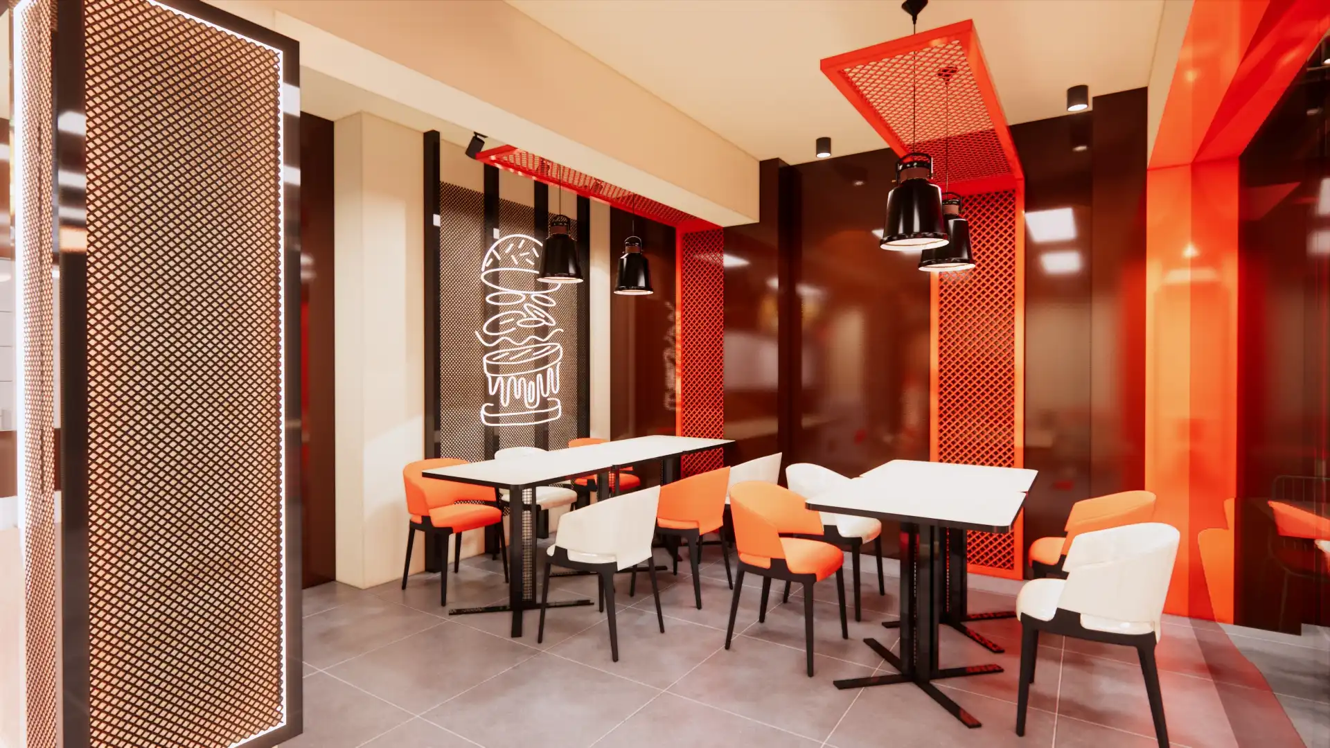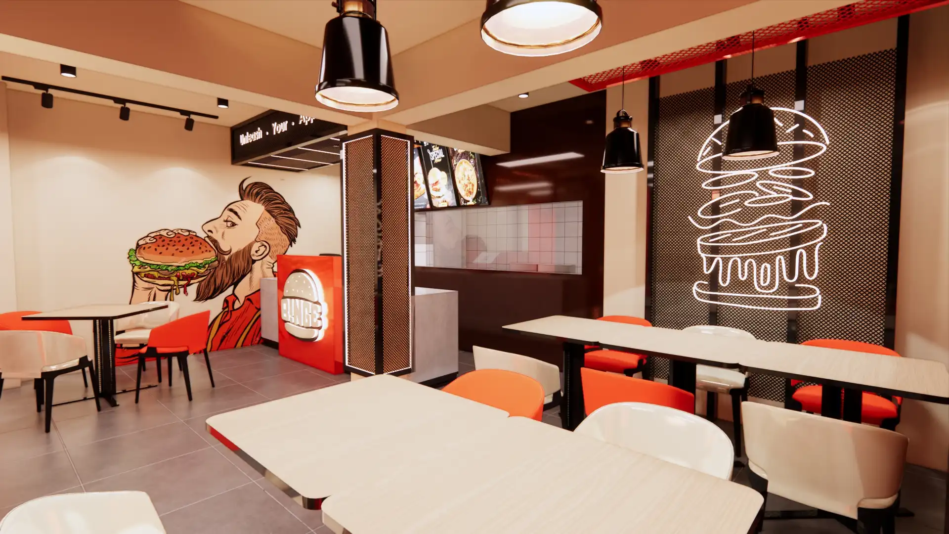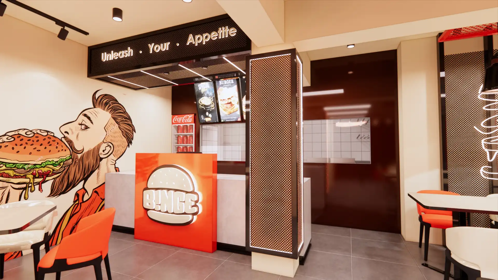 Binge is a vibrant burger joint that celebrates the art of the smash burger. With bold red and black branding, illuminated signage, and playful interiors, the space radiates energy and urban charm. Inside, murals and neon burger icons create a thematic atmosphere, while modern furniture and warm lighting invite diners to linger. The design balances functionality with personality, ensuring every detail—from seating to counter displays—reinforces the brand’s youthful identity. More than a fast-food stop, Binge is a destination where flavor and design collide, offering customers not just a meal but a lively, immersive experience rooted in contemporary culture.